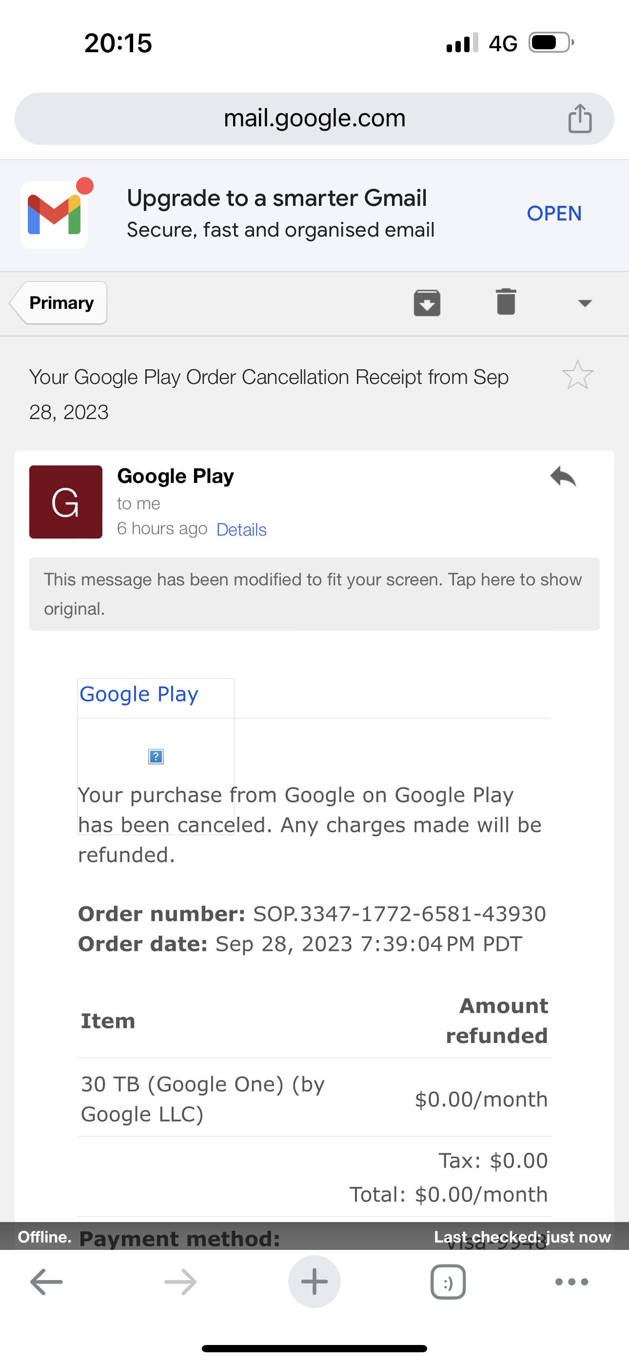 Your purchase from Google on Google Play has been canceled. Any charges made will be refunded.