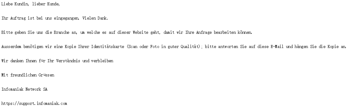 尊敬的客户, 您的订单已被我们收到。 谢谢。 请告诉我们行业该网站的内容,以便我们处理您的请求。 我们还需要您的身份证复印件(扫描或照片质量好); 请回复此电子邮件并附上副本。 我们感谢您的理解并留下来 最好的问候 Infomaniak Network SA